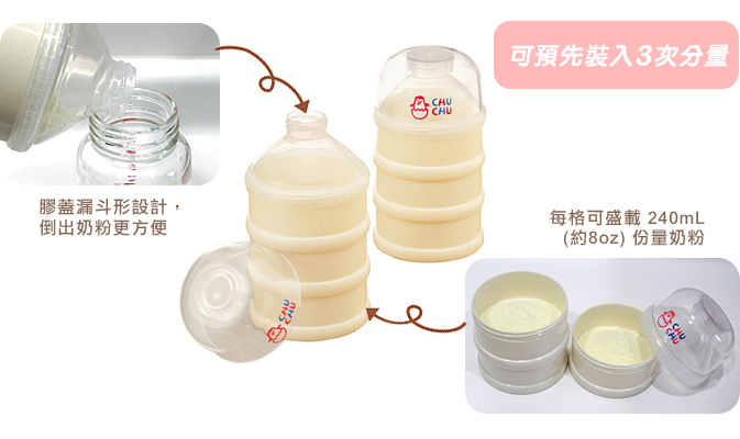 每格可盛載 240mL(約8oz) 份量奶粉,高度密封,清潔衛生